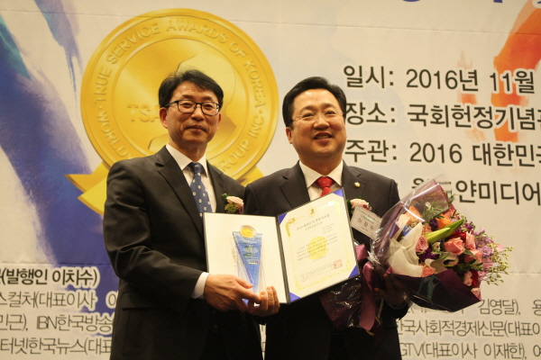 이 의원은 이날 국회 헌정기념관 대강당에서 2016 대한민국 참 봉사대상 조직위원회(위원장 문희 전 국회의원)가 주최한 참 봉사대상 시상식에서 이치수 대회장<사진 왼쪽>이 수여하는 ‘지역발전부문’ 지역발전창조대상을 받았다.