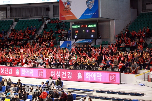 지역 연고단인 인삼공사 배구단과 본 지구와의 협력을 통해 배구단 선전을 위한 취지로 전개된 이번 업무협약에 이어 기업은행과의 경기에 참가한 라이온 모두는 열띤 응원과 경기관람을 가졌다.