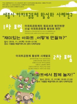 2차 포럼은 12월 1일 오후 7시‘아파트에서 함께 놀자!’라는 주제로 세종시 아파트공동체 활성화 사례발표를 활동가 강연 후 청중 토론을 벌일 계획이다.