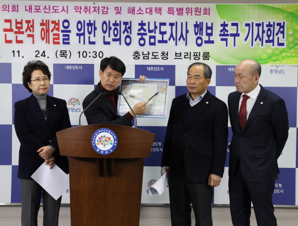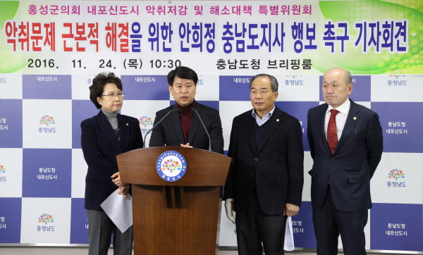 홍성군의회 내포신도시 악취저감 및 해소대책 특별위원회 이상근 위원장과 4명의 위원들은 24일 10시30분 도청 브리핑 룸에서 기자회견을 열고 내포신도시 축산악취문제의 근본적인 해결방안을 강력히 촉구했다.