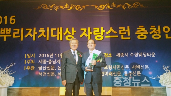 이석화 청양군수가 지방자치 발전에 기여한 공로를 인정받아 풀뿌리 자치대상 자랑스런 충청인상을 수상했다.
