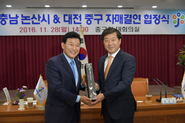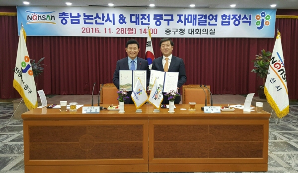황명선 논산시장과 박용갑 대전 중구청장이 상생협력을 위한 자매결연을 체결했다.