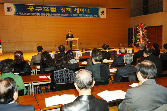 대전시 중구(구청장 이은권)는 둔산 신도시 개발로 인하여 주요기관과 인구가 빠져 나감으로써 지역 상권이 침체된 중구의 옛 명성을 되살리기 위해 지난 22일 대전대 혜화회관에서 2007 중구포럼 정책세미나를 가졌다.