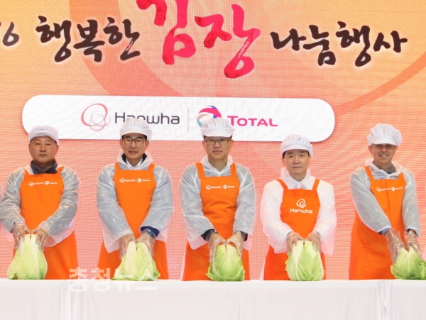 김장행사에 참석한 김희철 사장은 “한화토탈의 김장행사는 우리 회사와 지역주민 및 고객사를 하나로 이어주는 ‘소통’의 장으로 자리잡았다”며 “오늘 담근 김치가 우리 가정뿐만 아니라 지역 소외계층도 함께 나눌 ‘사랑의 김치’로 자리매김하길 기대한다”고 밝혔다.