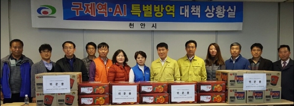 대한민국공무원노동조합총연맹(공노총) 위원장 이연월 당선자, 전국시군구공무원노동조합총연맹 위원장 석현정 당선자 등을 비롯한 새로운 지도부가 28일 천안시 AI 방역대책상황실을 찾아 고생하는 천안시청공무원노조 조합원을 격려하고 위문품을 전달했다.