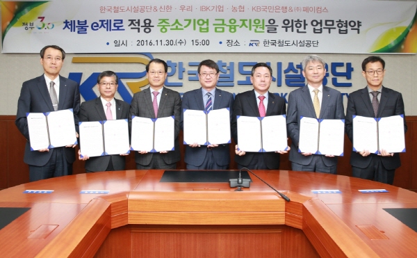 왼쪽부터 신한은행 서현주 부행장, IBK기업은행 성춘경 충청지역본부장, 우리은행 김재원 부행장, 철도공단 박인서 기획재무본부장, NH농협은행 박태석 부행장, KB국민은행 김양수 기업상품부장, (주)페이컴스 홍종열 대표이사 - 체불e제로 시스템 개발업체