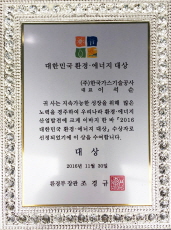 가스기술공사는 2015년 대한민국 환경에너지 기술부분(산업통상자원부 장관상) 대상을 수상한데 이어 올해 환경부분 대상까지 거머쥐며 2년 연속 대한민국 환경·에너지 대상의 영예를 차지함으로써 명실상부한 국내 환경 및 에너지 분야 선도 기술기업으로 발돋움하고 있다.