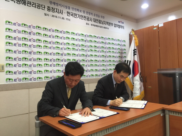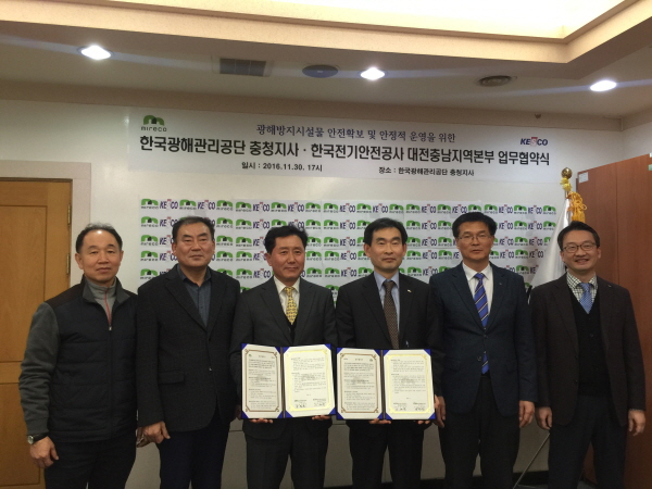 한국광해관리공단 충청지사는 30일 광해방지시설물 안전관리체계 강화를 위해 강철준 지사장, 이범욱 한국전기안전공사 대전충남본부장을 비롯한 양 기관 관계자들이 참석한 가운데 충청지사 회의실에서 전기안전 업무협약을 체결했다.