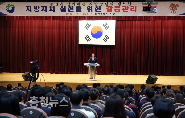 대전 서구(구청장 장종태)는 1일 구청 대강당에서 장종태 서구청장을 비롯해 직원 400여 명이 참석한 가운데, 주민과 함께하는 사람 중심의 행복한 지방자치 실현을 위한 ‘갈등관리’교육을 했다고 밝혔다.