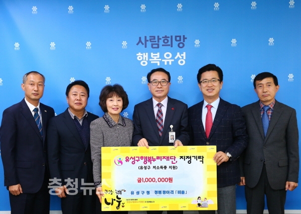 <사진자료 2> 대전 유성구 청렴동아리 ‘비움’(회장 김신환, 유성구 감사실장)이 5일 구청 행복사랑방에서 저소득계층 지원을 위해 써달라며 100만원의 후원금을 유성구행복누리재단에 지정 기탁한 가운데, 허태정 유성구청장(오른쪽 2번째), 김신환 청렴동아리 회장(오른쪽 3번째), 김홍혜 유성구행복누리재단 이사장(오른쪽 4번째)과 청렴동아리 회원들이 기념사진을 찍고 있다.