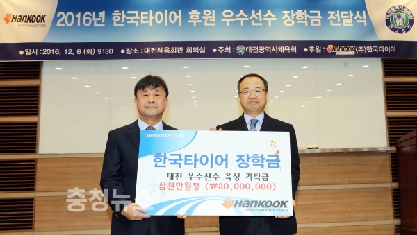 글로벌 선도 타이어 기업 한국타이어(대표이사 서승화)는 6일 대전 중구 부사동 소재 오전 대전시체육회관 강당에서 한국타이어 대전공장 유경곤 부공장장과 대전시 체육회 권도순 수석부회장 및 관계자 등이 참석한 가운데 우수 체육 선수 장학금 전달식을 진행했다.