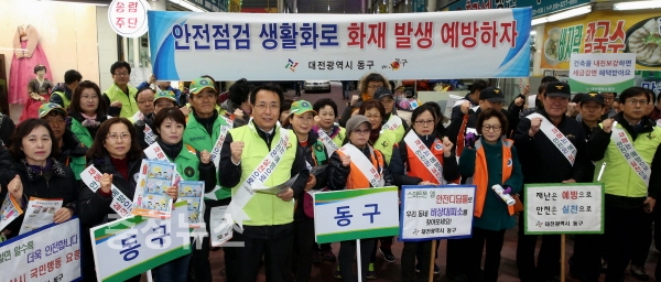 대전 동구는 7일 중앙시장 일원에서 제249차 안전점검의 날을 맞아 한현택 동구청장을 비롯해 구청 직원, 안전모니터봉사단, 지역자율방재단 등 100여 명이 참가한 가운데 전통시장 화재예방 캠페인을 펼쳤다.