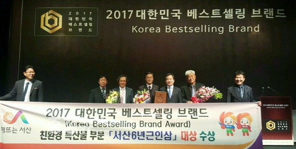 시에 따르면 8일 서울 그랜드 하얏트호텔에서 개최된 2017년 대한민국 베스트셀링 브랜드 시상식에서 서산 6년근 인삼이 ‘친환경 지역 특산물 부문 대상’ 을 받았다.