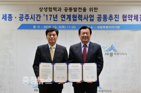 충남 공주시(시장 오시덕)와 세종특별자치시(시장 이춘희)가 8일 오전 11시 세종특별자치시청에서 2017 지역행복생활권 연계협력사업 공동추진 협약을 체결했다고 밝혔다.