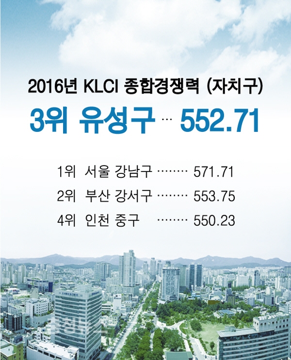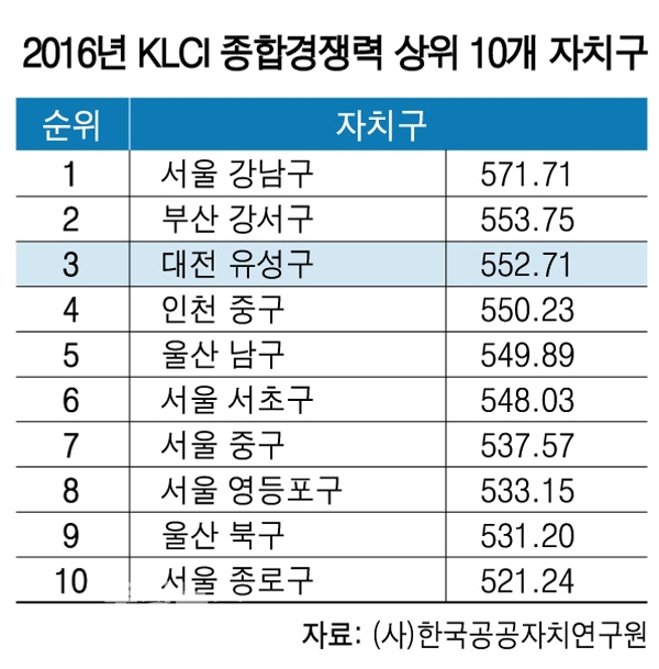 지난해 전국 4위의 지방자치경쟁력을 보였던 대전 유성구가 올해 전국 3위에 오르는 기염을 발휘했다.