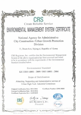 금번 인증 취득은 공동주택과 산업용지가 근접해 위치해 있는 도시첨단산업단지의 특성을 고려해 산업단지 행정서비스 전 분야에서 환경 법규 준수, 환경관리 최적화를 추진한 결과이다