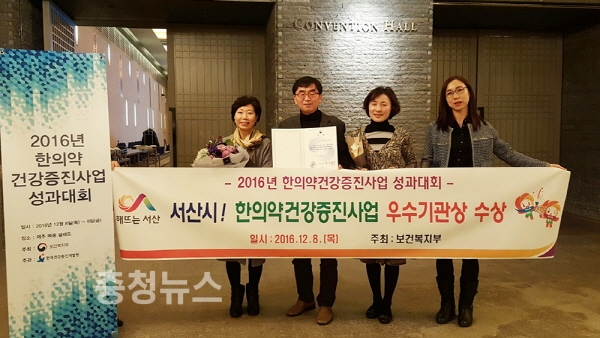 충남 서산시 보건소가 보건복지부에서 주관하는 ‘2016 한의약건강증진사업 평가’ 에서 우수기관으로 선정돼 8일 보건복지부 장관상을 받았다.