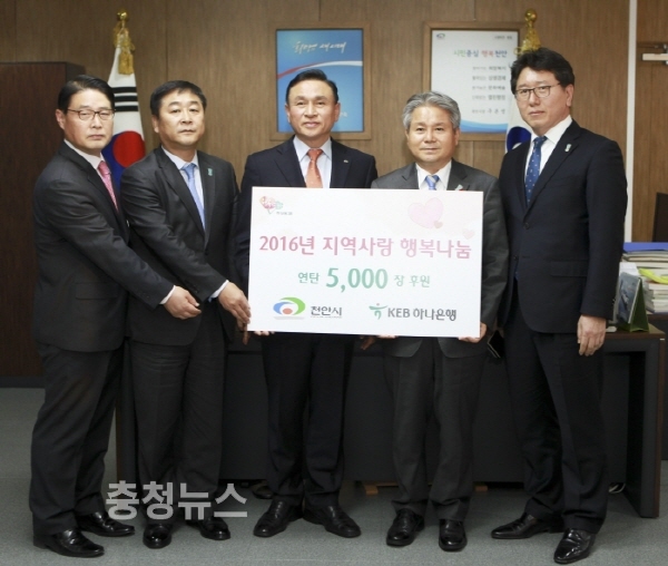 KEB하나은행 천안중앙지점(지점장 정근수)은 9일 천안시를 방문하여 난방비 문제로 어려움을 겪고 있는 이웃들을 위하여 사랑의 연탄 5000장(300만원 상당)을 기부했다.