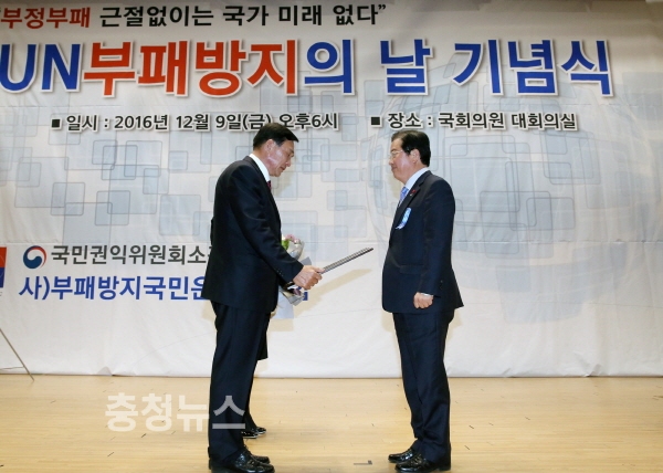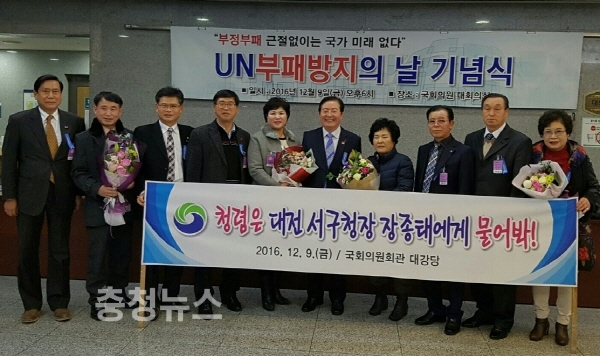 장종태 서구청장이 지난 9일 국민권익위원회 소관 (사)부패방지국민운동총연합(전국중앙회장 박승한)에서 개최한 UN 부패방지의 날 기념식에서 ‘이 시대 한국을 빛낸 청렴인 대상’을 수상하는 영예를 안았다.
