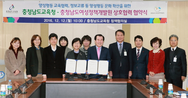 충남도교육청(교육감 김지철)이 12일 충남교육청 정책협의실에서 충남여성정책개발원(원장 안정선)과 양성평등 교육 협력사업 발굴을 위한 상호협력 협약을 체결했다.