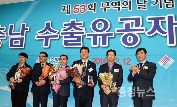 수출 유공 도지사 표창은 김상도 지니스 대표와 허상희 ㈜유진 대표, ㈜에프엠 손호식 부장, ㈜이-글벳 정연근 공장장, 수출유관기관 종사자인 충남경제진흥원 조광옥 과장 등 5명이 받았다.