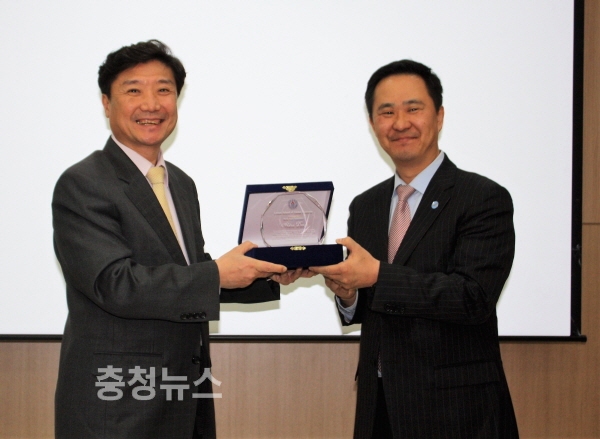 P한국사무소장에게 감사패를 전달하고 있는 박광일 학장