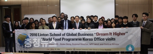 오는 12월 12일 한남대학교(총장 이덕훈) 린튼글로벌비즈니스스쿨(학장 박광일) 국내·외 학생들은 국제정세 흐름 및 국제개발협력분야 동향에 대한 깊은 이해를 제고하기 위하여 ‘Dream it Higher' 유엔세계식량계획 한국사무소(소장 임형준) 방문 및 WFP 특강 참석