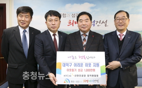 KT&G 신탄진공장(공장장 조종철)에서는 13일 어려운 이웃들을 위해 사용해 달라며 성금1,000만원을 대덕구(구청장 박수범)에 기탁했다.