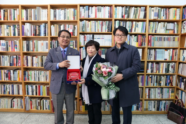 한남대 이덕훈 총장은 이날 도서 비치가 마무리된 인문학도서관으로 고인의 부인 신영희씨와 아들 김기홍씨를 초청해 감사패를 증정했다.