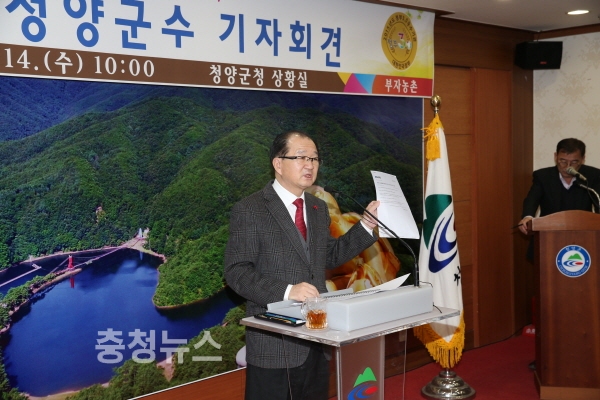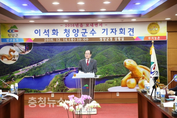 충남 이석화 청양군수가 14일 오전 10시 군청 상황실에서 기자회견을 개최해 2016년을 마무리하면서 올해 이룬 군정 성과와 내년도 비전을 밝히고, 최근 지역 일부에서 제기된 의혹을 해소하는 시간을 가졌다.