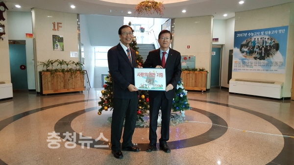 연탄기증기념사진(좌측 연탄은행대표 전갑재목사와 우측 이현복지사장)