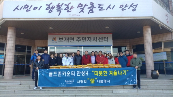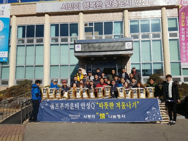 골프존카운티 안성H, 안성W, 안성Q 등 3개 골프장은 지난 14일과 15일 양일간 안성시청 및 사업장 소재 면사무소(보개면, 양성면, 죽산면)와 함께 '따뜻한 겨울나기 사랑의 정 나눔' 행사를 진행하며, 조손가정과 홀몸노인 가구 등에 1,200만 원 상당의 쌀을 전달했다.