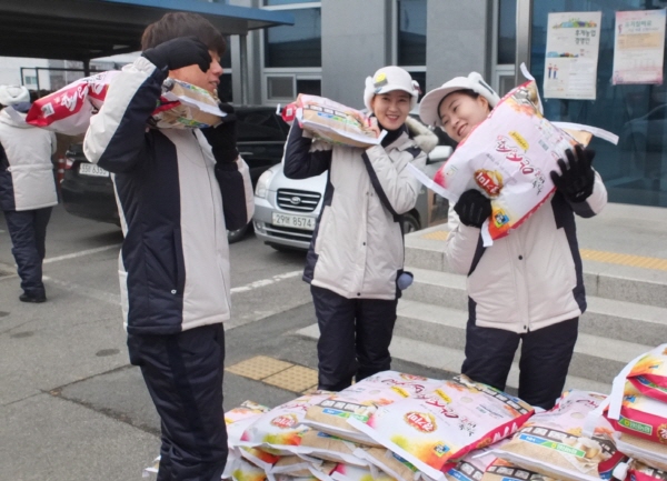(안성H) : 골프존카운티 안성H 임직원들이 지난 15일 경기도 안성시 보개면 주민자치센터를 찾아 도움이 필요한 이웃주민에 1,200만원 상당의 쌀을 전달하고 있다.