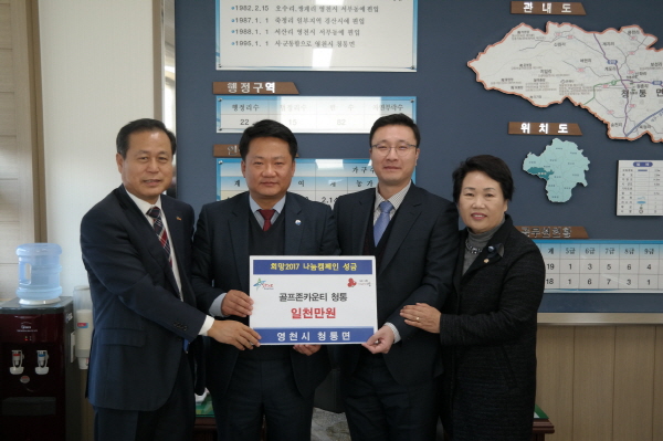 이밖에도 골프존카운티 청통은 지난 15일 영천시 청통면사무소에서 성금 1,000만원 전달식을 가졌다.