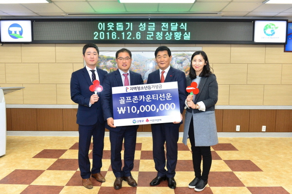 골프존카운티 선운은 지난 6일 고창군청에서 '지역 소외계층 아동 및 청소년을 위한 이웃돕기 성금 전달식'을 갖고 고창군 희망복지재단에 성금 1,000만원을 기부했다.