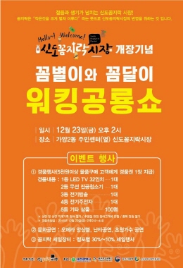 한편, ‘꼼지락’은 “작은 것을 크게 펼쳐 이루다”라는 뜻으로 신도시장의 번영을 기원하는 의미있고 독특한 명칭으로, 최근 소비자 트렌드에 맞춰 경쟁력을 갖춘 젊고 생기 있는 시장으로의 발전과 성공을 염원하는 상인들의 의지가 고스란히 담겨 있다.