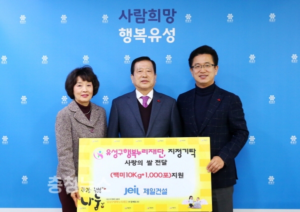대전 유성구는 19일 오전 제일건설 윤여웅 대표이사가 구청을 방문해 저소득가정 등 관내 어려운 이웃들을 위해 써달라며 백미 1000포(1포 10㎏)를 전달했다고 밝혔다.