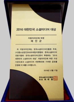 충남 태안군이 한국 소셜미디어 진흥원이 주관한 ‘2016년 대한민국 소셜미디어 대상’에서 지방자치단체 부문 대상을 수상하는 쾌거를 거뒀다.