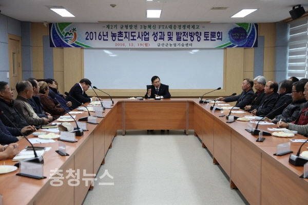 금산군농업기술센터(소장 이갑수)는 19일 오후 2시 금산군농업기술센터 1층 다목적회의실에서 박동철 군수를 비롯한 금산군품목농업인연구협의회 임원진과 품목연구회 회장단 등 50여명이 참석한 가운데 2016년 농촌지도사업 성과보고 및 발전방안 토론회를 가졌다.