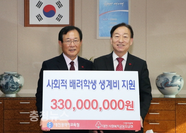 대전시교육청(교육감 설동호)은 2016 「제자사랑 나눔 캠페인」을 통해 모금된 교직원들의 성금 2억8천8백만원과 시민들에 의해 모금된 4천2백만원 등 3억3천만원을 사회적배려대상학생 생계비 및 교육비 지원을 위해 대전사회복지모금회를 통해 전달했다고 밝혔다.