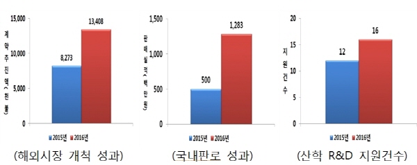 창업기업 30개사의 마케팅 등을 지원해 고용 창출 51명, 지식재산권 29건(출원 10, 등록 19) 및 제품인증 6건을 달성했다. 또 혁신형 기업이 크게 증가하여, 최근 2년간 평균 증가율이 약 20%로 전국평균 5%를 크게 상회했다.