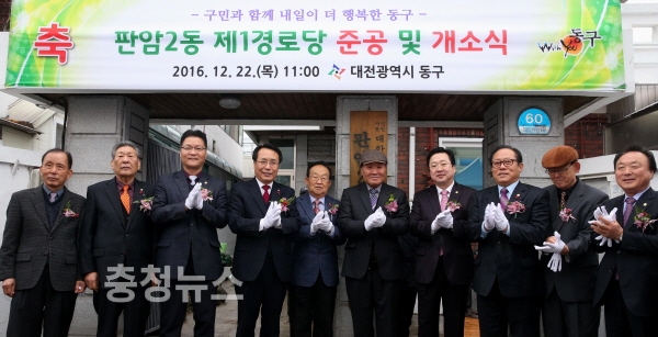 대전 동구(구청장 한현택)는 22일, 한현택 동구청장을 비롯한 강봉섭 노인회동구지회장, 구의원 등 지역주민 100여 명이 참석한 가운데 판암2동 제1경로당 준공 및 개소식 행사를 가졌다고 밝혔다.