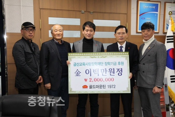 금산 향토봉사단체 ‘골드마운틴1972’(회장 김형열)는 23일 오전 금산군청에서 박동철 금산군수, 조신영 금산교육사랑장학재단 이사장, 김형열 ‘골드마운틴1972’ 회장을 비롯한 회원 등이 참석한 가운데 금산교육사랑장학재단에 인재 육성을 위한 장학금 200만원을 기탁했다.