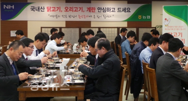농협 충남지역본부(본부장 유찬형)는 고병원성 조류인플루엔자(AI) 확산으로 어려움을 겪고 있는 양계농가를 돕기 위해 23일 충남농협 구내식당에서 삼계탕 시식행사를 실시하였다.