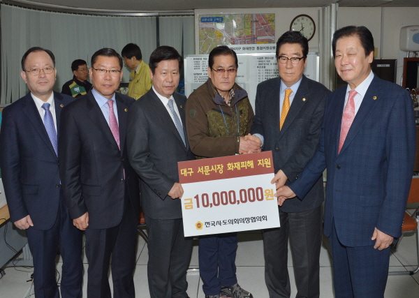 전국시도의회의장협의회는 23일 대구 서문시장 화재피해 현장을 찾아 화재 피해 복구활동 지원금 1천만원을 전달했다.