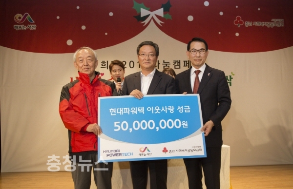이에 앞서 지난달 25일 현대파워텍 문홍기 총무실장은 읍내동 서산시 문화회관에서 열린 ‘희망 2017 나눔캠페인’ 모금행사에 참석해 이웃사랑 성금 5천만원을 전달하고, 14일 지곡면사무소에서 열린 모금행사에 지곡면 기초수급 및 차상위계층 가정 50세대에 난방용품을 지원했다.