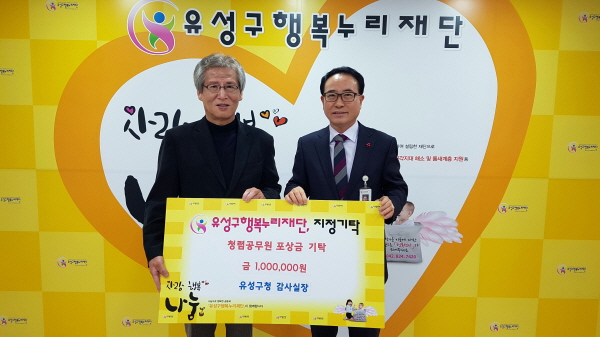 대전 유성구 김신환 감사실장(58)이 ‘2016년 시민이 뽑은 대전시 청렴공무원’으로 선정돼 받은 시상금 100만원을 기부한 사실이 알려져 훈훈함을 전하고 있다.