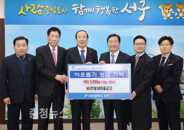 대전 서구(구청장 장종태)는 26일 구청 다목적실에서 MG한밭새마을금고(이사장 천순상)로부터 사랑 나눔 백미 5,000kg를 사회복지공동모금회를 통해 기탁받았다고 밝혔다.