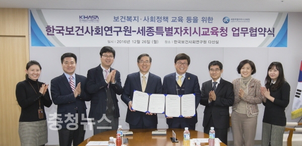 세종특별자치시교육청(교육감 최교진청)이 26일 세종국책연구단지 내에 자리잡은 한국보건사회연구원(원장 김상호)과 업무협약을 체결하고 세종시 관내 학생과 지역주민을 대상으로 사회복지정책에 대한 이해도를 높여가는데 힘을 모으기로 했다.