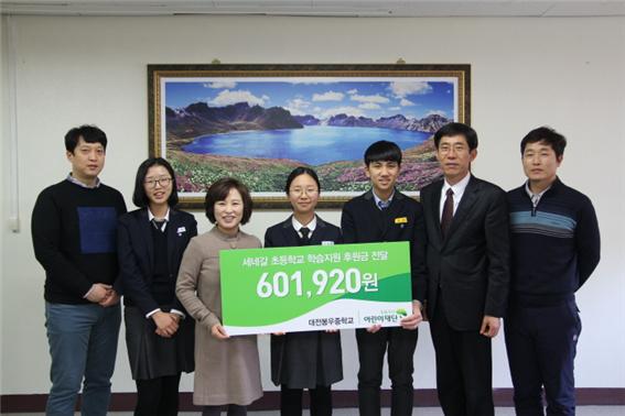 대전봉우중학교(교장 전홍식)는 29일 오전 대전 서구 관저동에 위치한 대전봉우중학교 교장실에서 전홍식 대전봉우중학교장과 손록희 학생회장, 임원단이 참석한 가운데 세네갈 초등학교 학습지원을 위한 후원금 601,920원을 초록우산어린이재단에 전달했다.